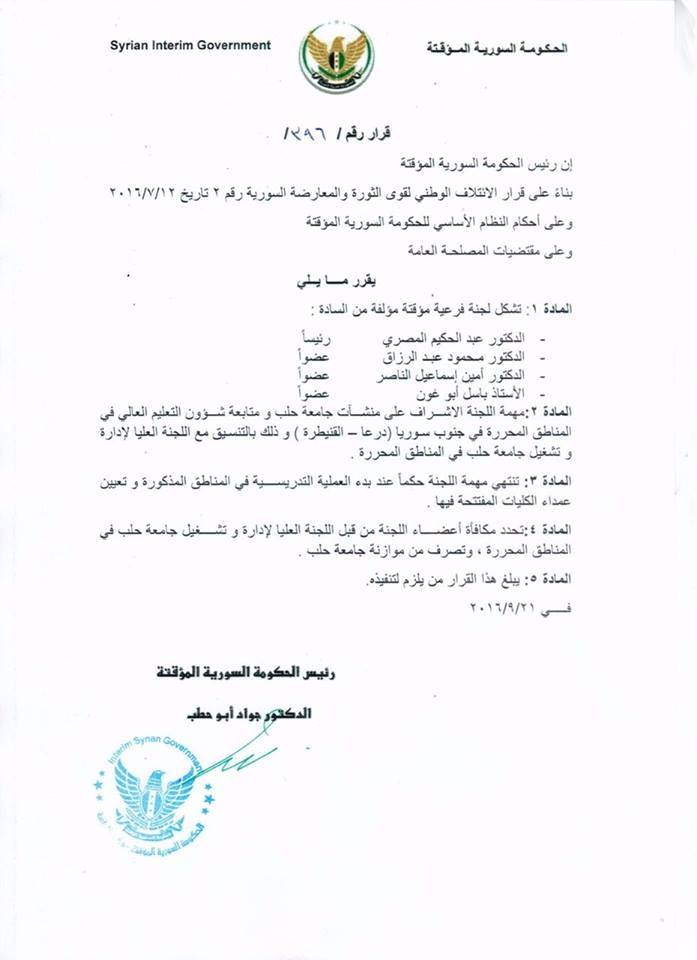 الحكومة السورية تصدر القرار /396/ القاضي بتشكيل لجنة فرعية مؤقتة مهمتها الإشراف على منشآت جامعة حلب ومتابعة شؤون التعليم العالي في المناطق المحررة في جنوب سوريا (درعا-القنيطرة).