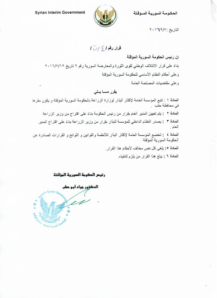 قرار الحكومة السورية المؤقتة بإتباع المؤسسة العامة لإكثار البذار لوزارة الزراعة في الحكومة السورية