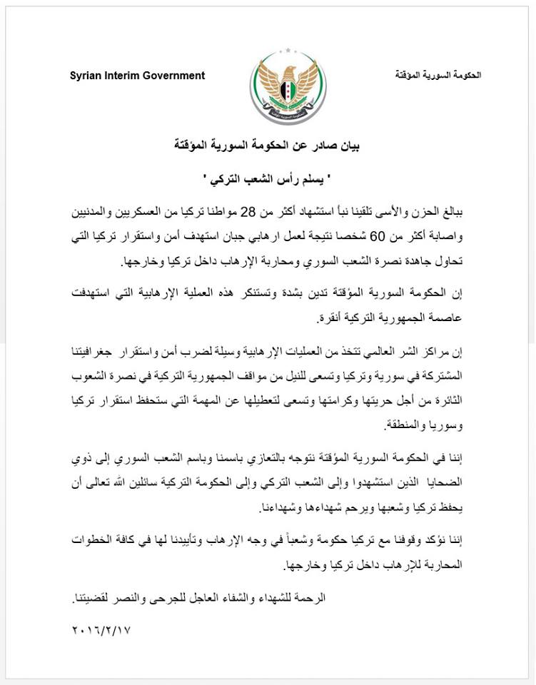 إن الحكومة السورية المؤقتة تدين بشدة وتستنكر هذه العملية الإرهابية التي استهدفت عاصمة الجمهورية التركية أنقرة.