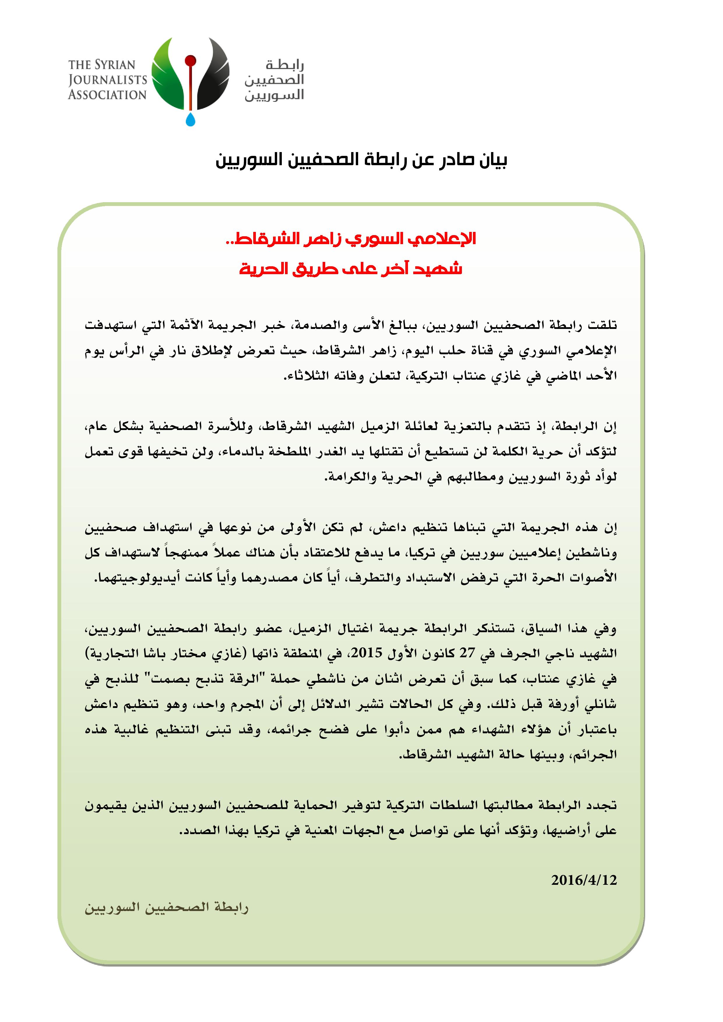 بيان رابطة الصحفيين السوريين تدين اغتيال الشهيد زاهر الشرقاط