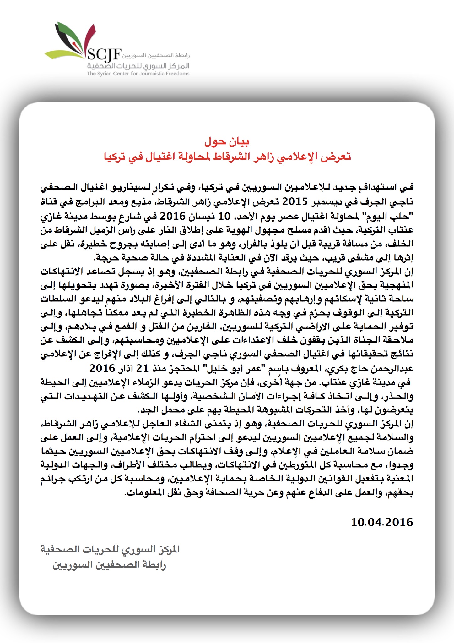 إن المركز السوري للحريات الصحفية في رابطة الصحفيين، وهو إذ يسجل تصاعد الانتهاكات المنهجية بحق الإعلاميين السوريين في تركيا خلال الفترة الأخيرة، بصورة تهدد بتحويلها إلى ساحة ثانية لإسكاتهم وإرهابهم وتصفيتهم، و بالتالي إلى إفراغ البلاد منهم ليدعو السلطات التركية إلى الوقوف بحزم في وجه هذه الظاهرة الخطيرة التي لم يعد ممكناً تجاهلها، وإلى توفير الحماية على الأراضي التركية للسوريين، الفارين من القتل و القمع في بلادهم، وإلى ملاحقة الجناة الذين يقفون خلف الاعتداءات على الإعلاميين ومحاسبتهم، وإلى الكشف عن نتائج تحقيقاتها في اغتيال الصحفي السوري ناجي الجرف، و كذلك إلى الإفراج عن الإعلامي عبدالرحمن حاج بكري، المعروف باسم "عمر أبو خليل" المحتجز منذ 21 آذار 2016 في مدينة غازي عنتاب.