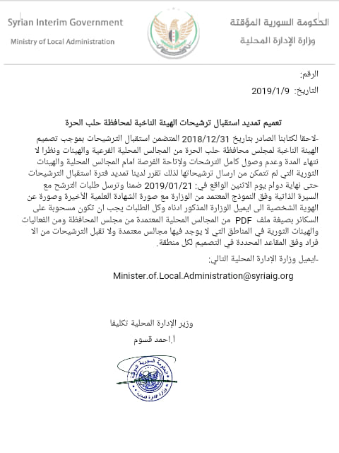 تعميم تمديد استقبال طلبات الترشح للهيئة الناخبة لمجلس محافظة حلب الحرة