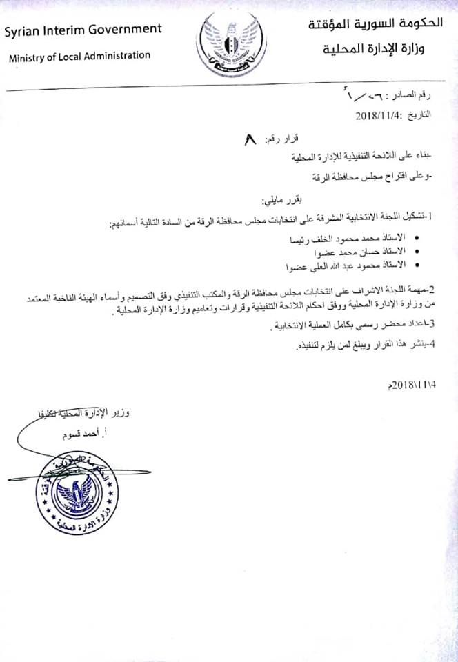قرار تشكيل اللجنة الانتخابية لمحافظة الرقة