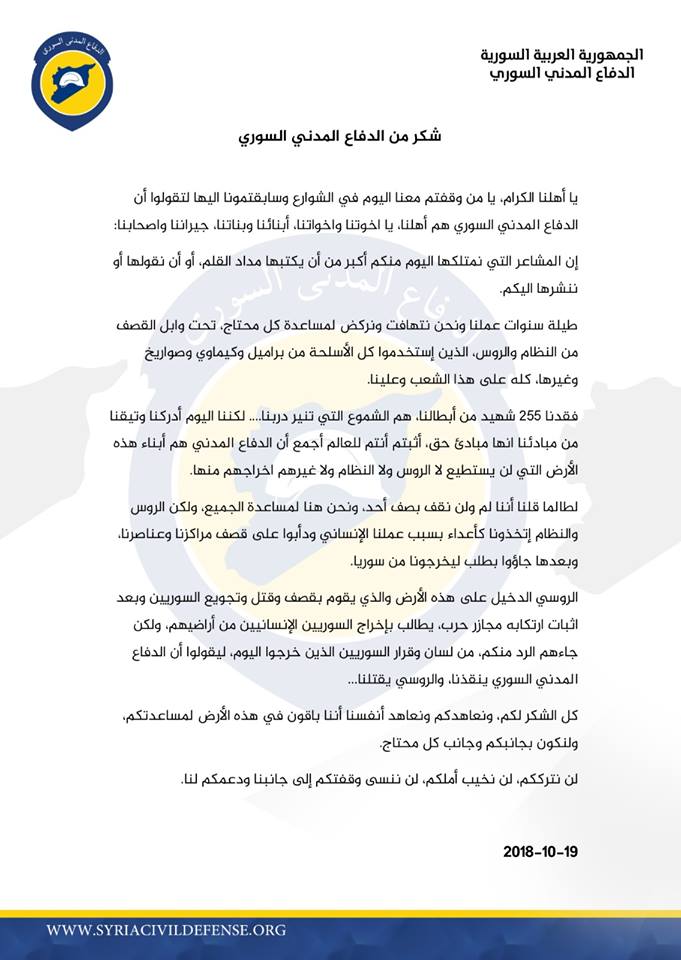 بيان شكر من الدفاع المدني لأهلنا في سوريا وكل من وقف معنا اليوم في شوارع وساحات الحرية