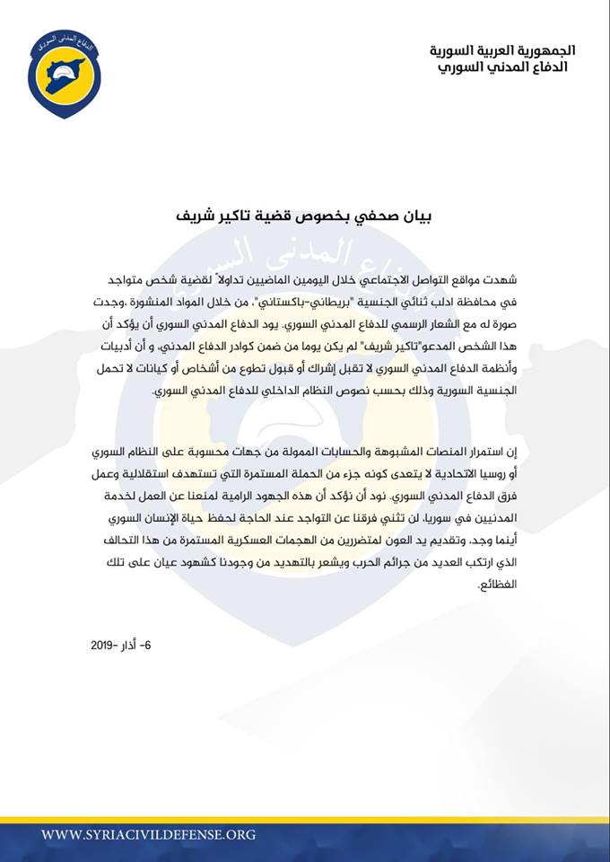 بيان صحفي من الخوذ البيضاء بخصوص قضية تاكير شريف