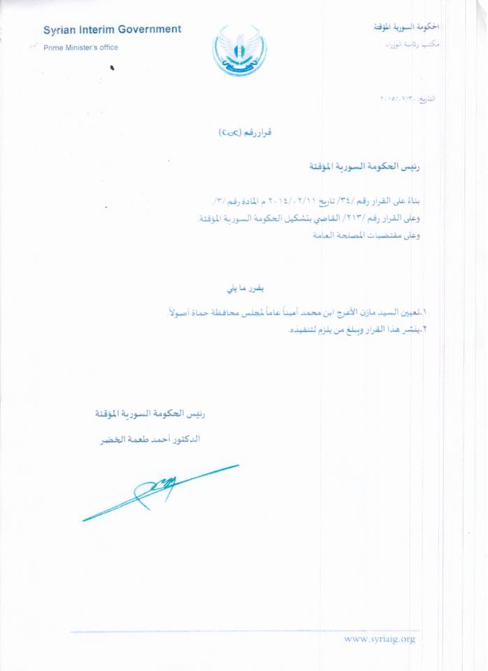 قرار تعين الأمين العام لمجلس محافظة حماة