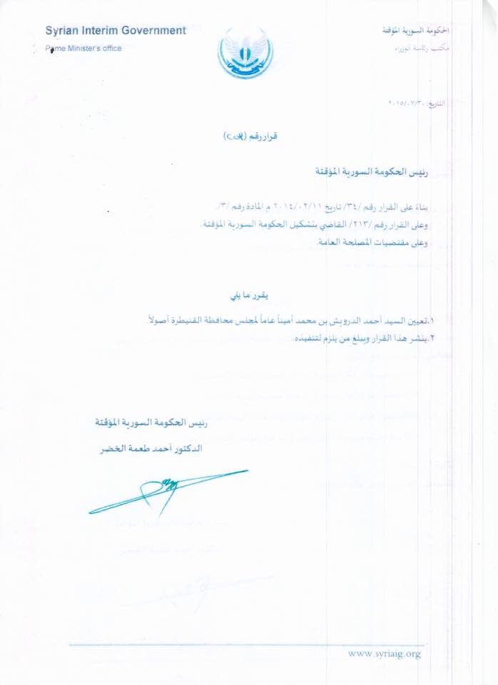 قرار تعين الأمين العام لمجلس محافظة القنيطرة