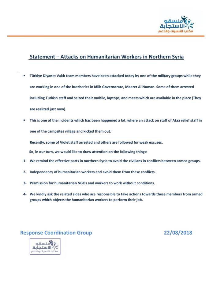 بيان لـ"منسقو استجابة سوريا" حول الاعتداء على العاملين الانسانيين في الشمال السوري