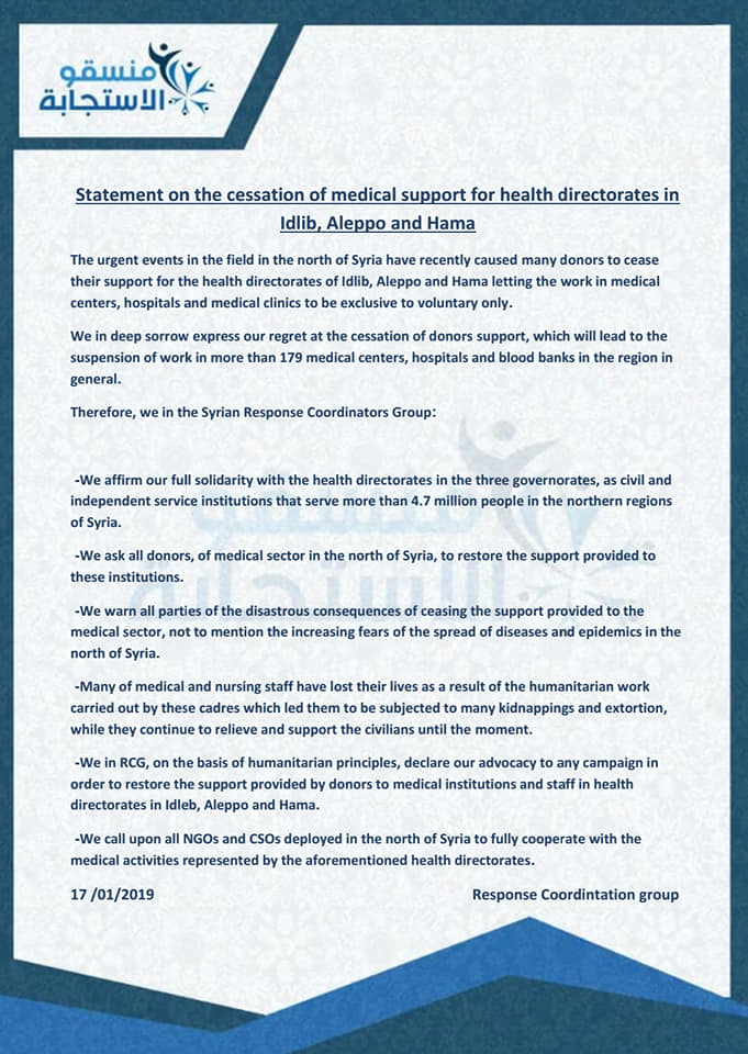 بيان من منسقو الاستجابة بشأن توقف الدعم الطبي عن مديريات الصحة في إدلب وحلب وحماة