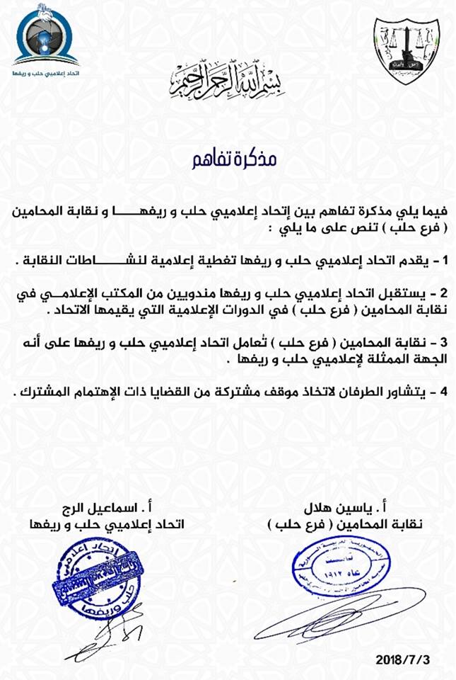 توقيع مذكرة تفاهم بين كلٍ من اتحاد إعلاميي حلب و ريفها و نقابة المحامين الأحرار / فرع حلب