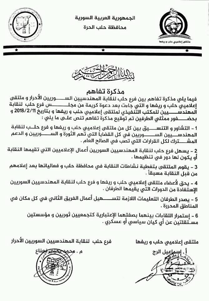 توقيع مذكرة تفاهم بين ملتقى إعلامي حلب وريفها ونقابة المهندسيين السوريين الأحرار فرع حلب.