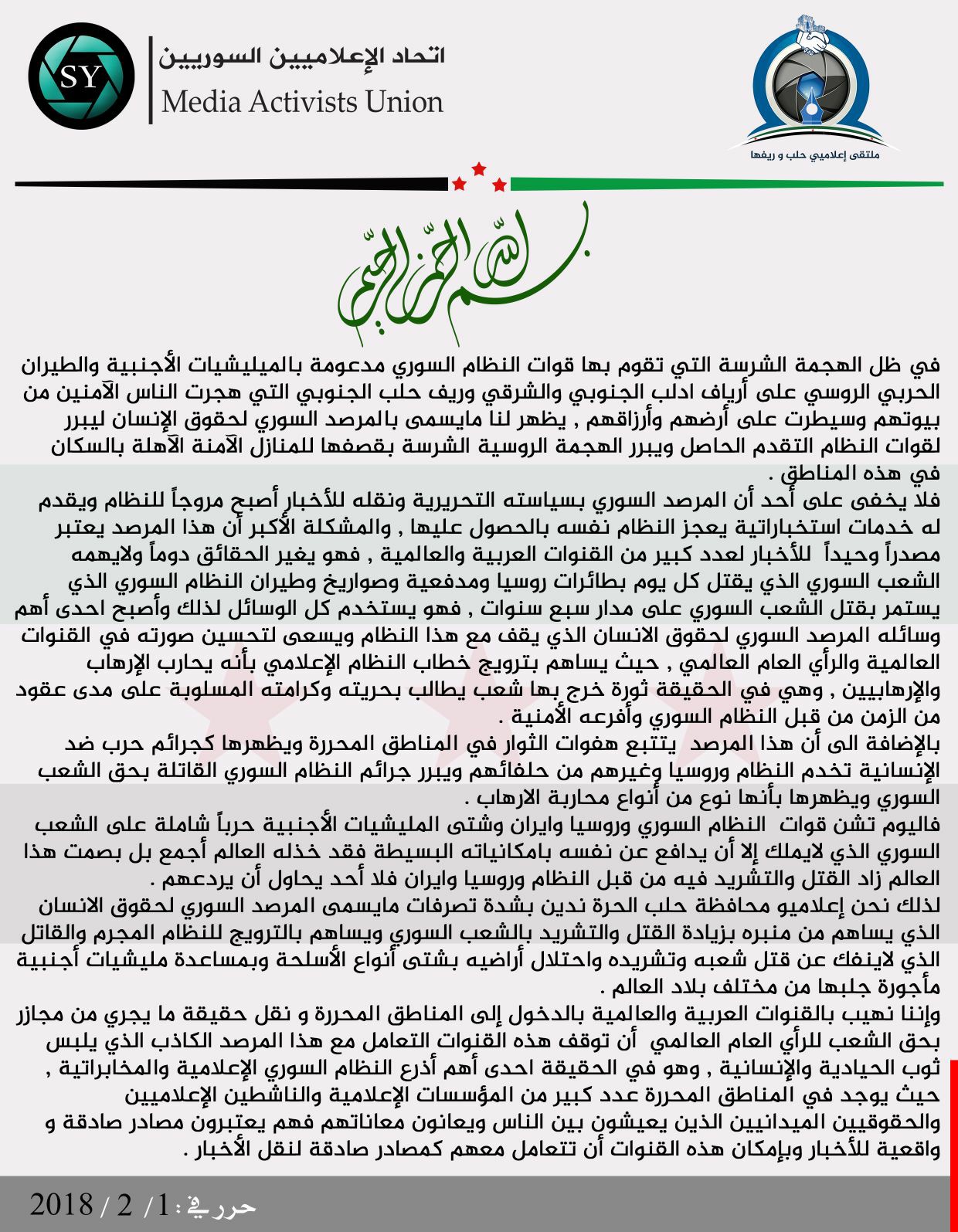 بيان مشترك بين إعلاميي حلب وريفها موجهة لوسائل الإعلام العربية والعالمية حول مايقوم به المرصد السوري بنشره وترويجه من أكاذيب وتزيف للحقائق في الواقع السوري.