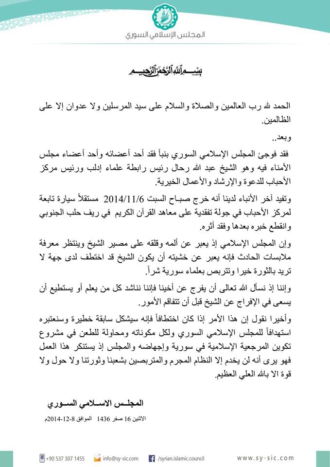 وإن المجلس الإسلامي إذ يعبر عن ألمه وقلقه على مصير الشيخ وينتظر معرفة ملابسات الحادث فإنه يعبر عن خشيته أن يكون الشيخ قد اختطف لدى جهة لا تريد بالثورة خيرا وتتربص بعلماء سورية شراً.
