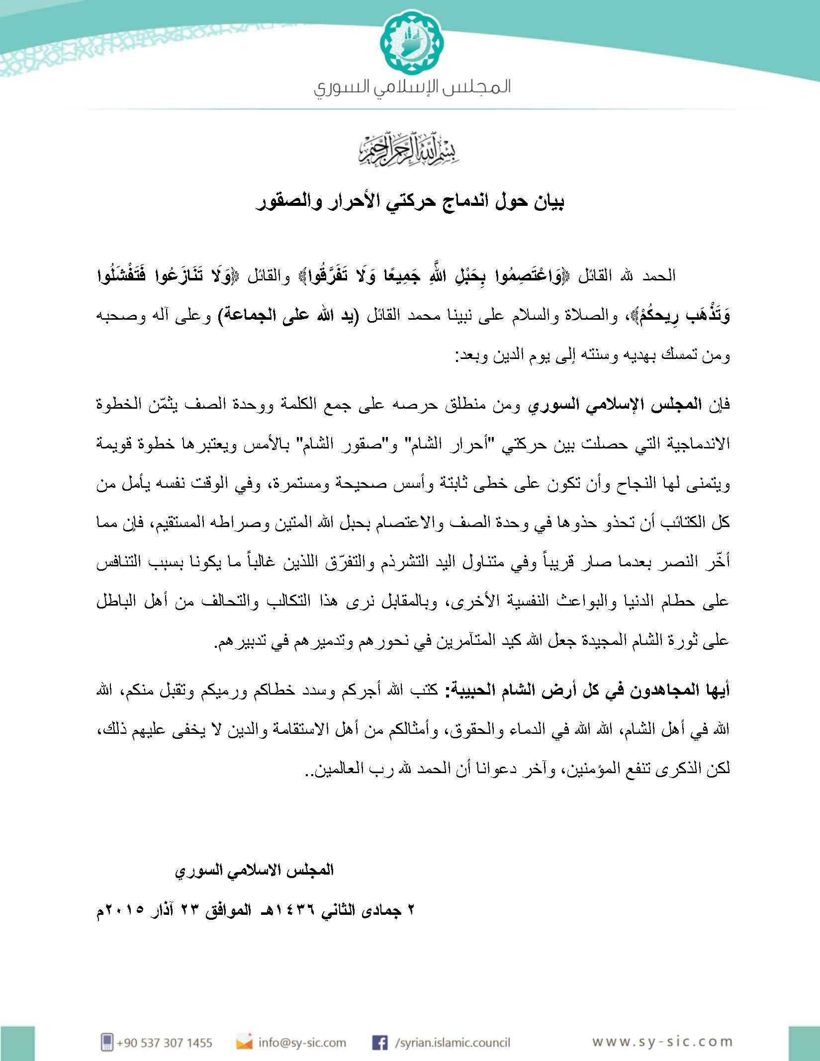 فإن المجلس الإسلامي السوري ومن منطلق حرصه على جمع الكلمة ووحدة الصف يثمّن الخطوة الاندماجية التي حصلت بين حركتي “أحرار الشام” و”صقور الشام” بالأمس ويعتبرها خطوة قويمة ويتمنى لها النجاح وأن تكون على خطى ثابتة وأسس صحيحة ومستمرة، وفي الوقت نفسه يأمل من كل الكتائب أن تحذو حذوها في وحدة الصف والاعتصام بحبل الله المتين وصراطه المستقيم، فإن مما أخّر النصر بعدما صار قريباً وفي متناول اليد التشرذم والتفرّق اللذين غالباً ما يكونا بسبب التنافس على حطام الدنيا والبواعث النفسية الأخرى، وبالمقابل نرى هذا التكالب والتحالف من أهل الباطل على ثورة الشام المجيدة جعل الله كيد المتآمرين في نحورهم وتدميرهم في تدبيرهم.
