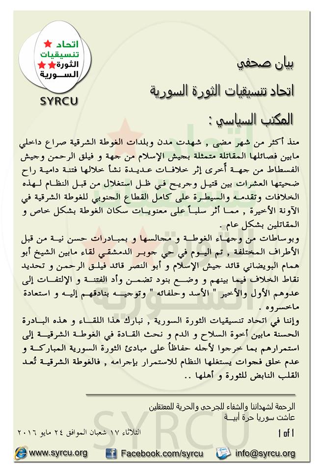 وإننا في اتحاد تنسيقيات الثورة السورية , نبارك هذا اللقاء و هذه البادرة الحسنة مابين أخوة السلاح و الدم و نحث القادة في الغوطة الشرقية إلى استمرارهم بما خرجوا لأجله حفاظاُ على مبادئ الثورة السورية المباركة و عدم خلق فجوات يستغلها النظام للإستمرار بإجرامه , فالغوطة الشرقية تُعد القلب النابض للثورة وأهلها .