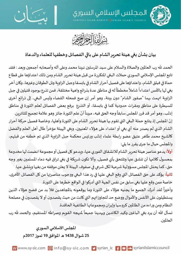 بيان صادر عن المجلس الإسلامي السوري بشأن بغي هيئة تحرير الشام على باقي الفصائل وخطفها للعلماء والدعاة