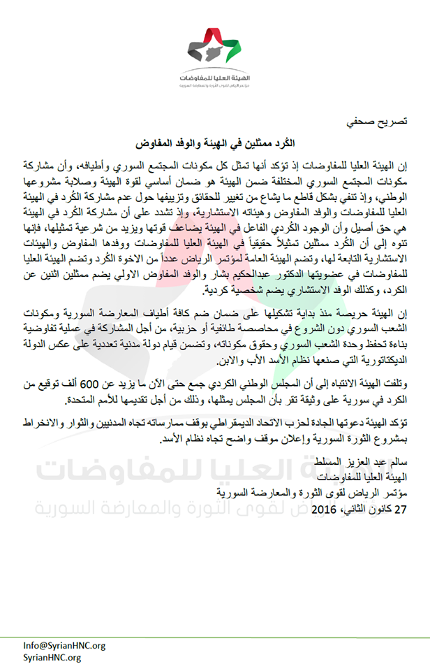 إن الهيئة العليا للمفاوضات إذ تؤكد أنها تمثل كل مكونات المجتمع السوري وأطيافه، وأن مشاركة مكونات المجتمع السوري المختلفة ضمن الهيئة هو ضمان أساسي لقوة الهيئة وصلابة مشروعها الوطني، وإذ تنفي بشكل قاطع ما يشاع من تغيير للحقائق وتزييفها حول عدم مشاركة الكُرد في الهيئة العليا للمفاوضات والوفد المفاوض وهيئاته الاستشارية، وإذ تشدد على أن مشاركة الكُرد في الهيئة هي حق أصيل وأن الوجود الكُردي الفاعل في الهيئة يضاعف قوتها ويزيد من شرعية تمثيلها، فإنها تنوه إلى أن الكُرد ممثلين تمثيلاً حقيقياً في الهيئة العليا للمفاوضات ووفدها المفاوض والهيئات الاستشارية التابعة لها، وتضم الهيئة العامة لمؤتمر الرياض عدداً من الاخوة الكُرد وتضم الهيئة العليا للمفاوضات في عضويتها الدكتور عبدالحكيم بشار والوفد المفاوض الاولي يضم ممثلين اثنين عن الكرد، وكذلك الوفد الاستشاري يضم شخصية كردية.