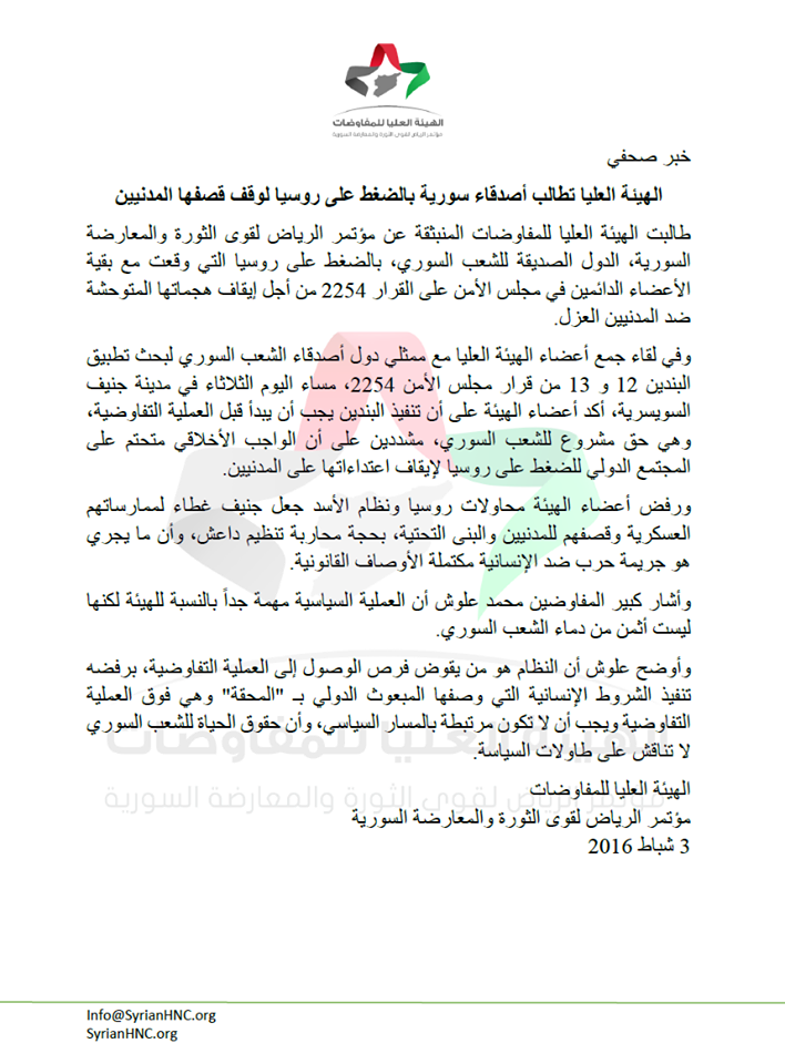 طالبت الهيئة العليا للمفاوضات المنبثقة عن مؤتمر الرياض لقوى الثورة والمعارضة السورية، الدول الصديقة للشعب السوري، بالضغط على روسيا التي وقعت مع بقية الأعضاء الدائمين في مجلس الأمن على القرار 2254 من أجل إيقاف هجماتها المتوحشة ضد المدنيين العزل.