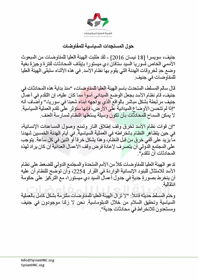 بيان الهيئة العليا للمفاوضات حول المستجدات السياسية للمفاوضات