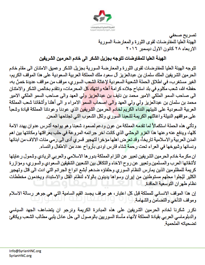 الهيئة العليا للمفاوضات تتوجه بجزيل الشكر الى خادم الحرمين الشريفين