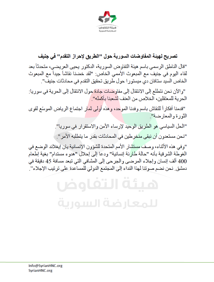 تصريح لهيئة المفاوضات السورية حول (الطريق لإحراز التقدم) في جنيف