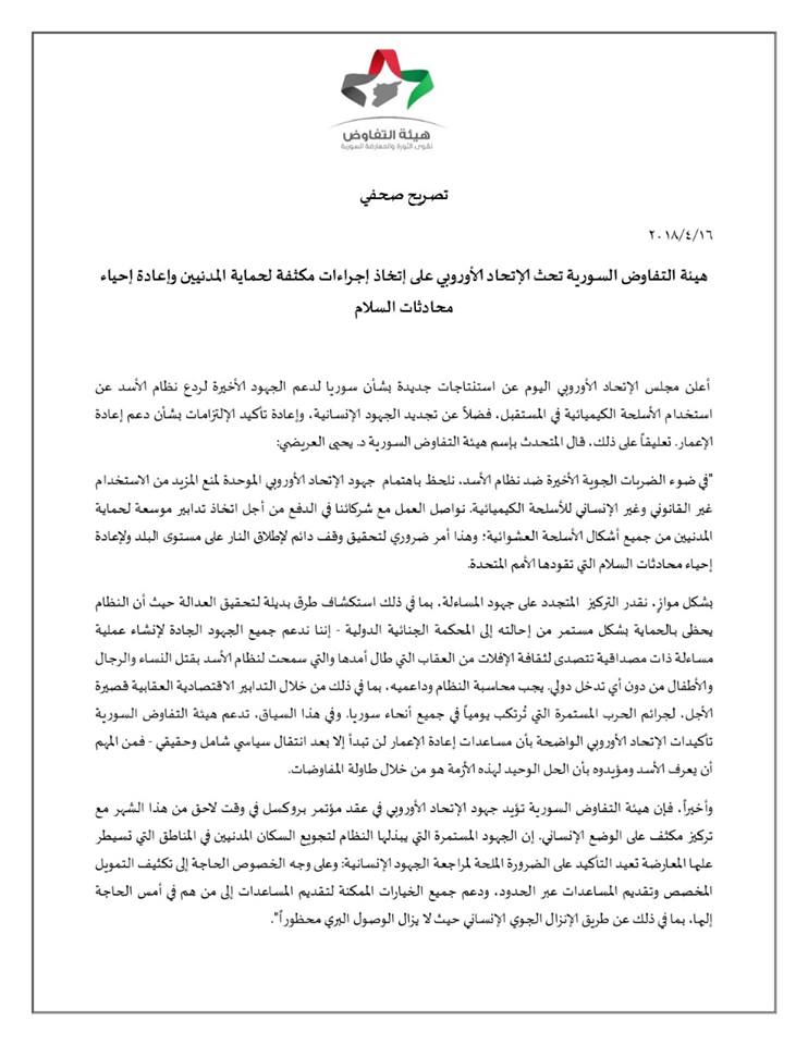 هيئة التفاوض السورية تحث الإتحاد الأوروبي على إتخاذ إجراءات مكثفة لحماية المدنيين وإعادة إحياء محادثات السلام