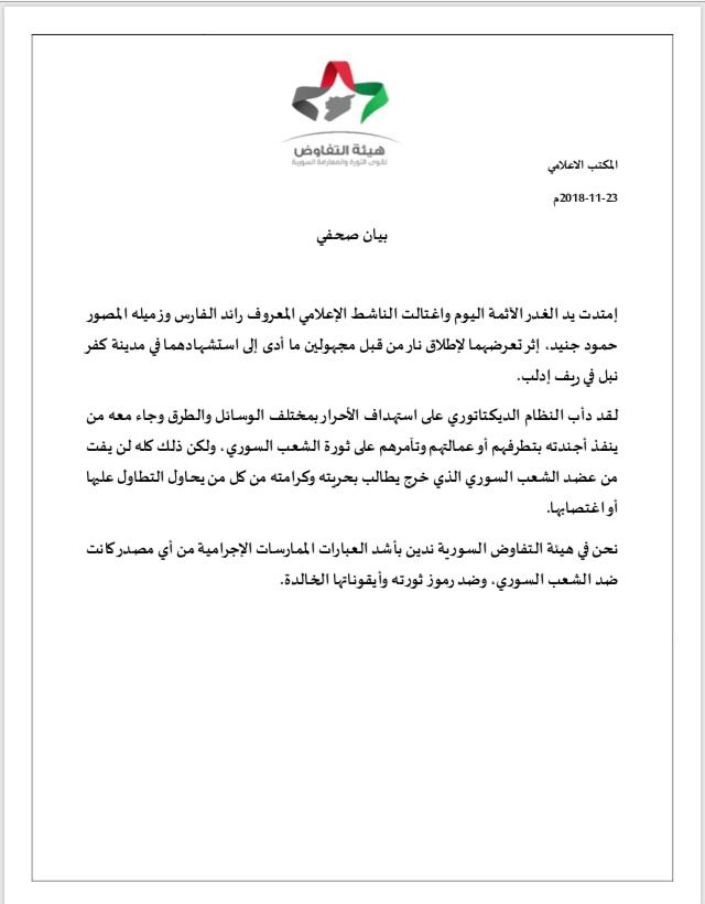 بيان إدانة لهيئة التفاوض السورية حول اغتيال الناشطين الإعلاميين رائد الفارس وحمود جنيد
