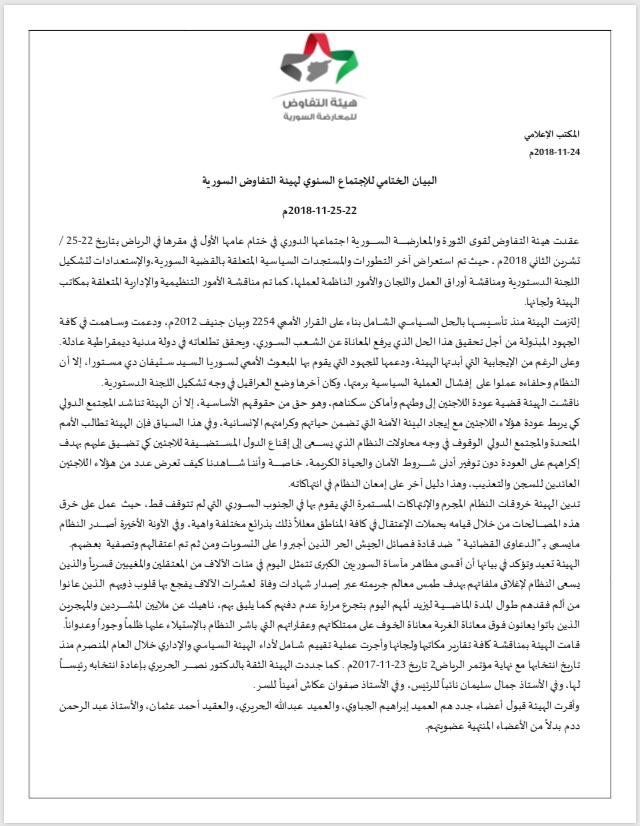 البيان الختامي للاجتماع السنوي لهيئة التفاوض السورية 22-25-11-2018