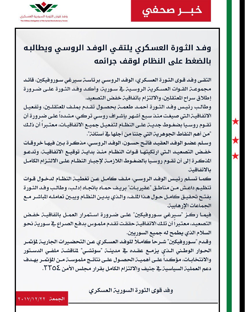 وفد الثورة العسكري يلتقي الوفد الروسي ويطالبه بالضغط على النظام لوقف جرائمه