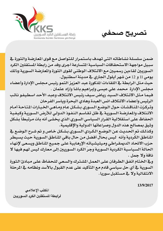 تصريح بشأن الإجتماع الذي جمع وفد من الرابطة مع الائتلاف الوطني لقوى الثورة في اسطنبول