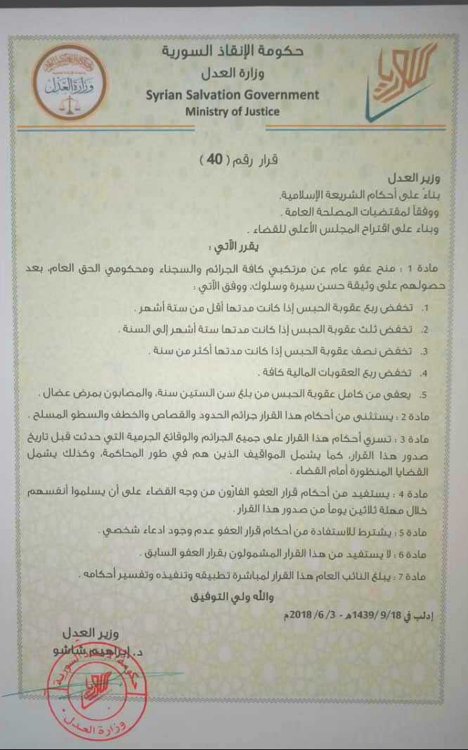 وزارة العدل تصدر القرار رقم / 40 / والمتضمن منح عفو عام عن المساجين ومحكومي الحق العام بمناسبة شهر رمضان وعيد الفطر