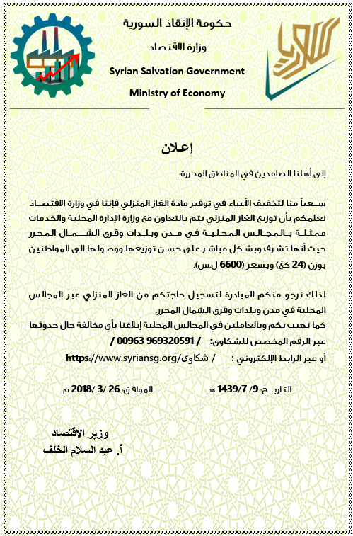 سعياً منا لتخفيف الأعباء في توفير مادة الغاز المنزلي فإننا في وزارة الإقتصاد نعلمكم بأن توزيع الغاز يتم بالتعاون مع وزارة الإدارة المحلية والخدمات ممثلة بالمجالس المحلية في مدن وبلدات قرى الشمال المحرر.