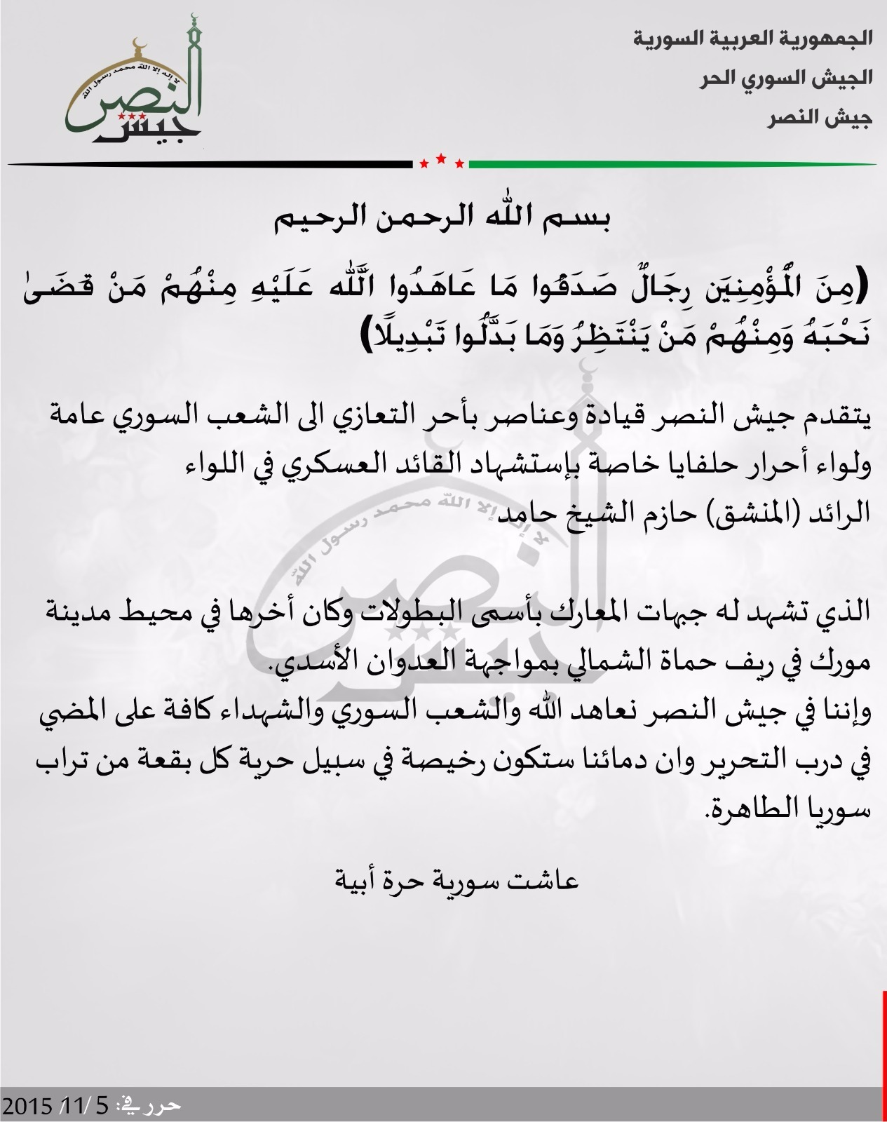 جيش النصر يعزي لواء أحرار حلفايا باستشهاد قائده العسكري حازم حامد