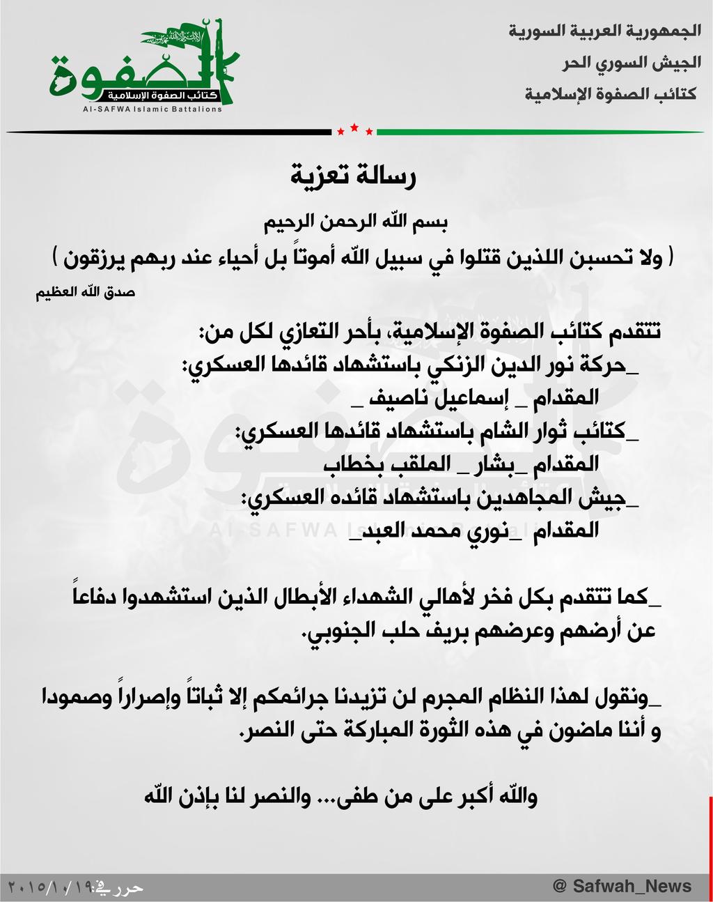 بيان تعزية من كتائب الصفوة لحركة الزنكي وجيش المجاهدين باستشهاد القادة إسماعيل ناصيف وبشار خطاب ونوري العبد