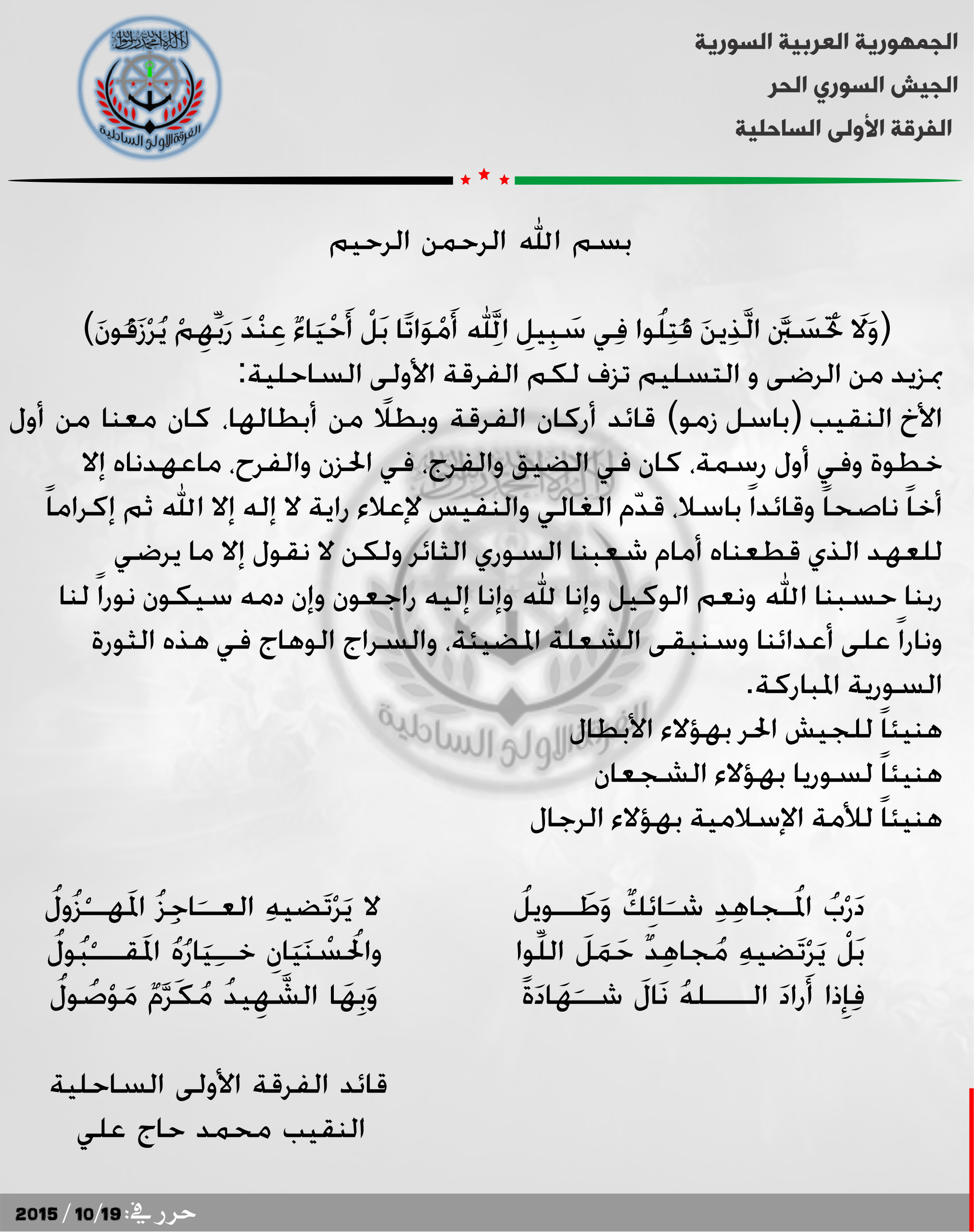 الفرقة الساحلية الأولى تنعي قائد أركانها باسل زمو