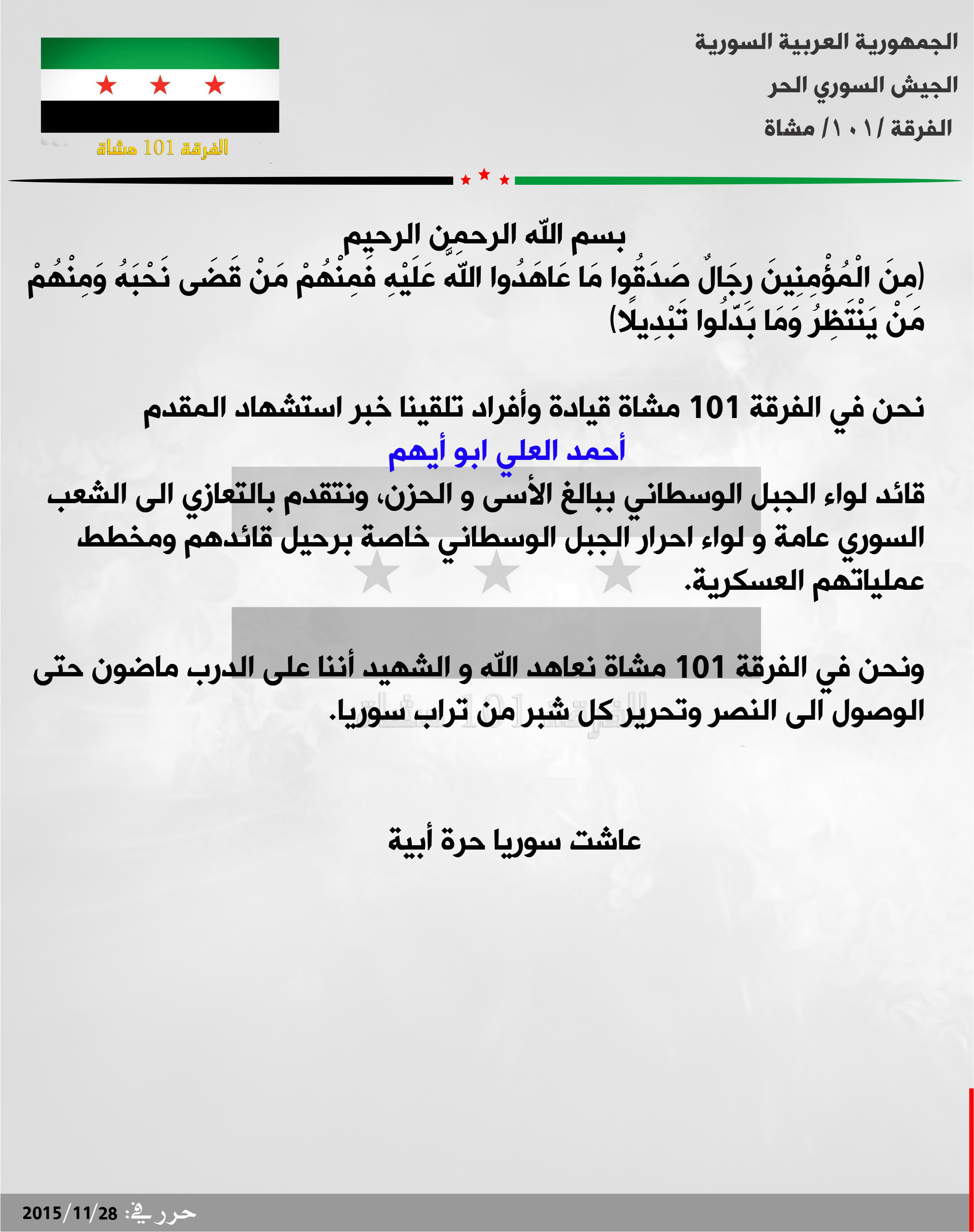 الفرقة 101 مشاة تعزي لواء الجبل الوسطاني باستشهاد قائده أحمد العلي أبو أيهم