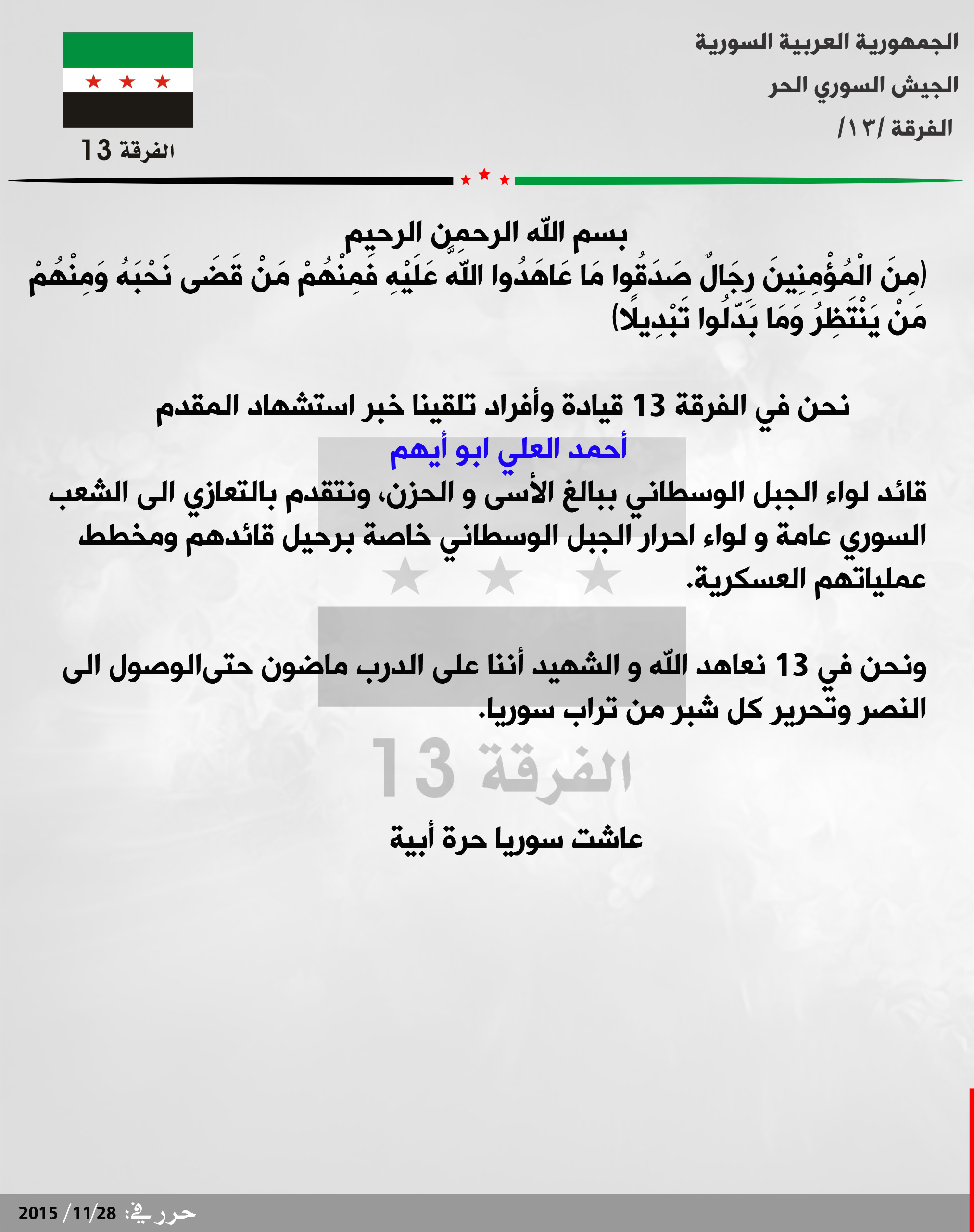الفرقة 13 تعزي لواء أحرار الجبل الوسطاني باستشهاد قائده أحمد العلي أبو أيهم