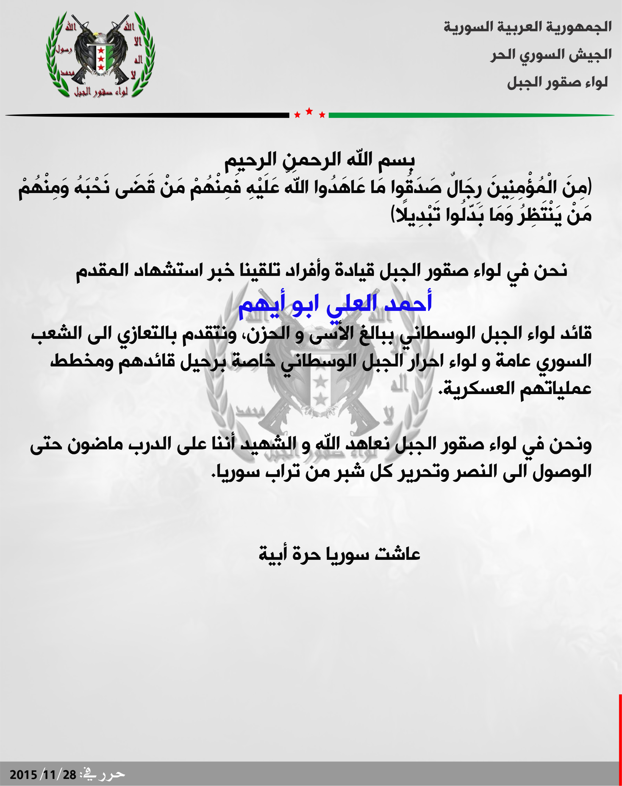 لواء صقور الجبل يعزي لواء أحرار الجبل الوسطاني باستشهاد قائده أحمد العلي أبو أيهم