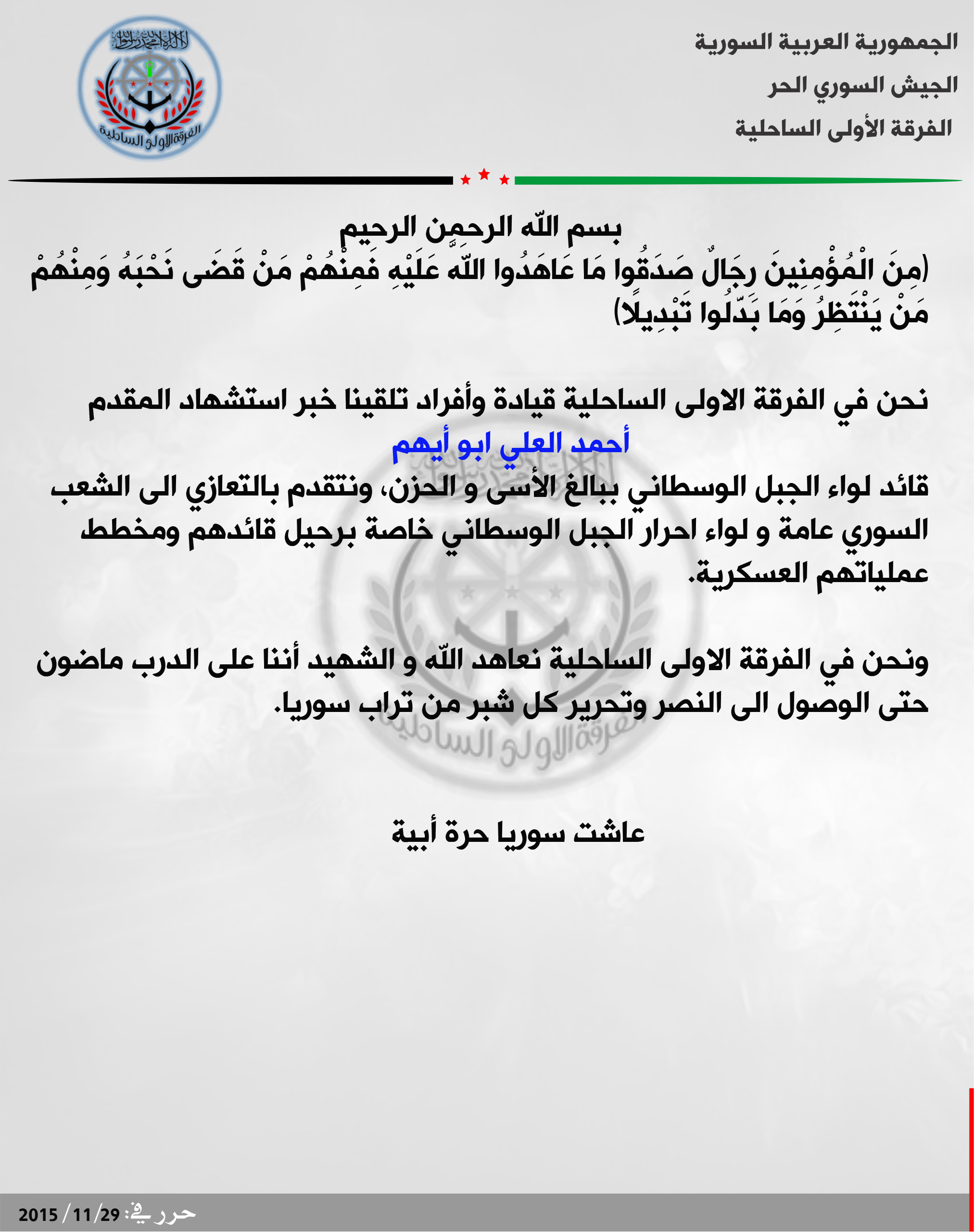 الفرقة الساحلية الأولى تعزي لواء أحرار الجبل الوسطاني باستشهاد قائده أحمد العلي أبو أيهم