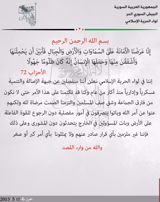 بيان إعلان لواء الحرية الإسلامي أنه منفصل عن جبهة الأصالة والتنمية