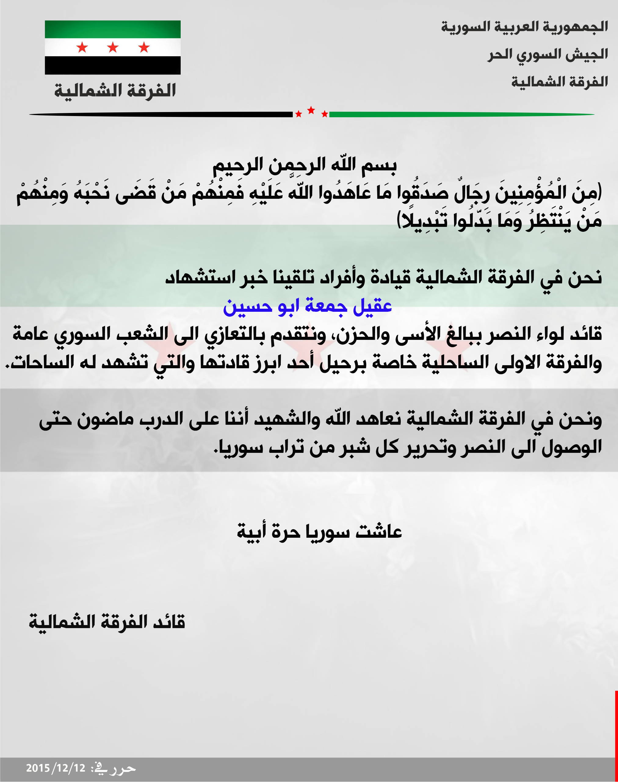 الفرقة الشمالية تعزي لواء النصر باستشهاد قائده عقيل جمعة أبو حسين