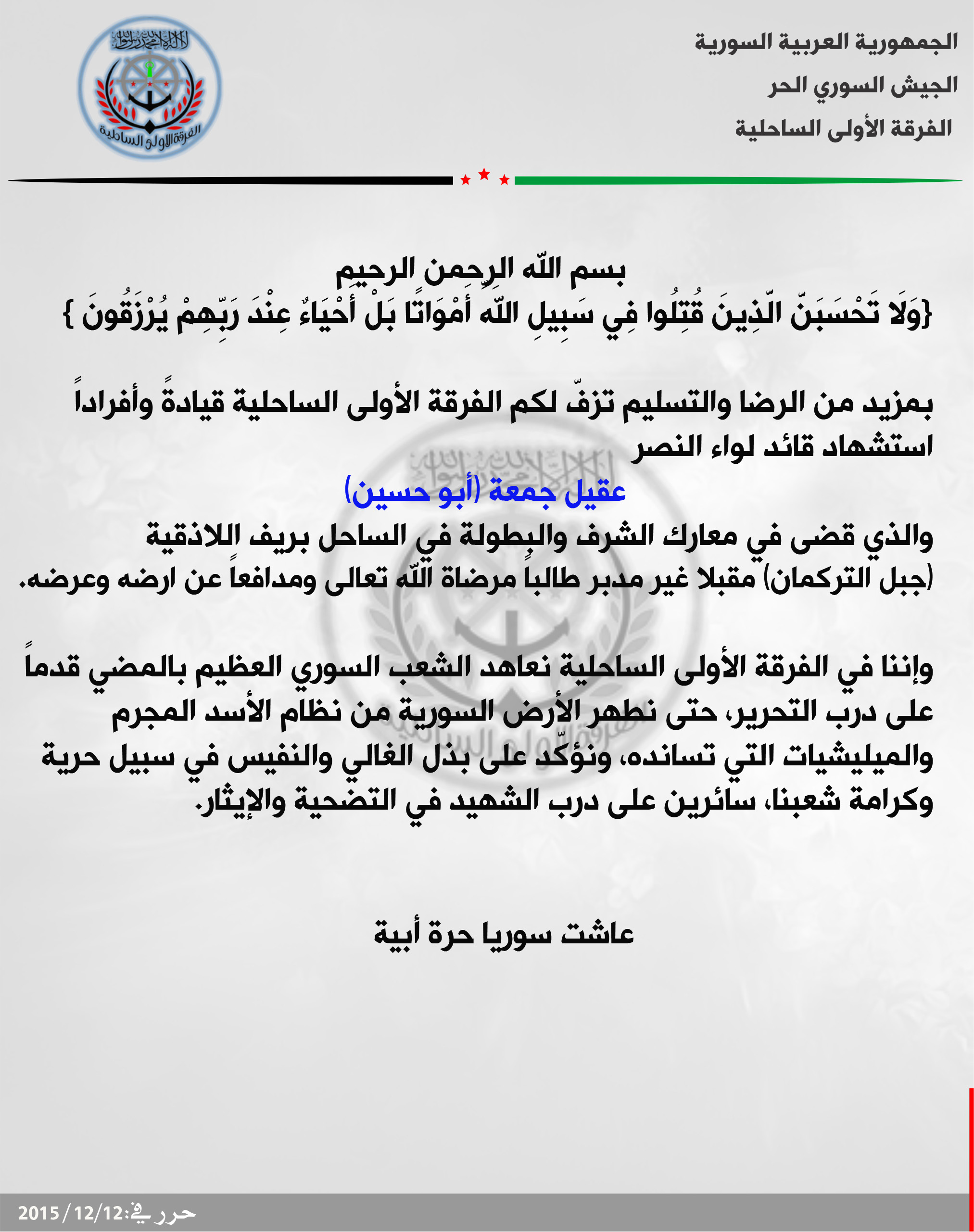 الفرقة الساحلية الأولى تنعي قائد لواء النصر عقيل جمعة أبو حسين