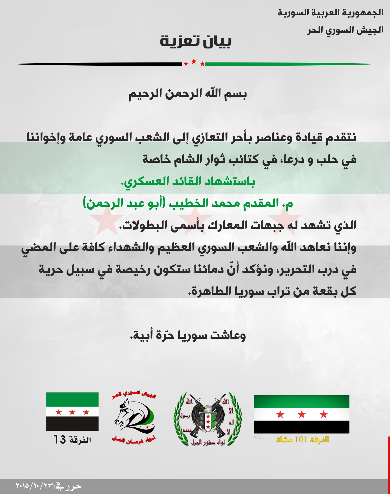 الجيش الحر يعزي كتائب ثوار الشام باستشهاد المقدم محمد الخطيب