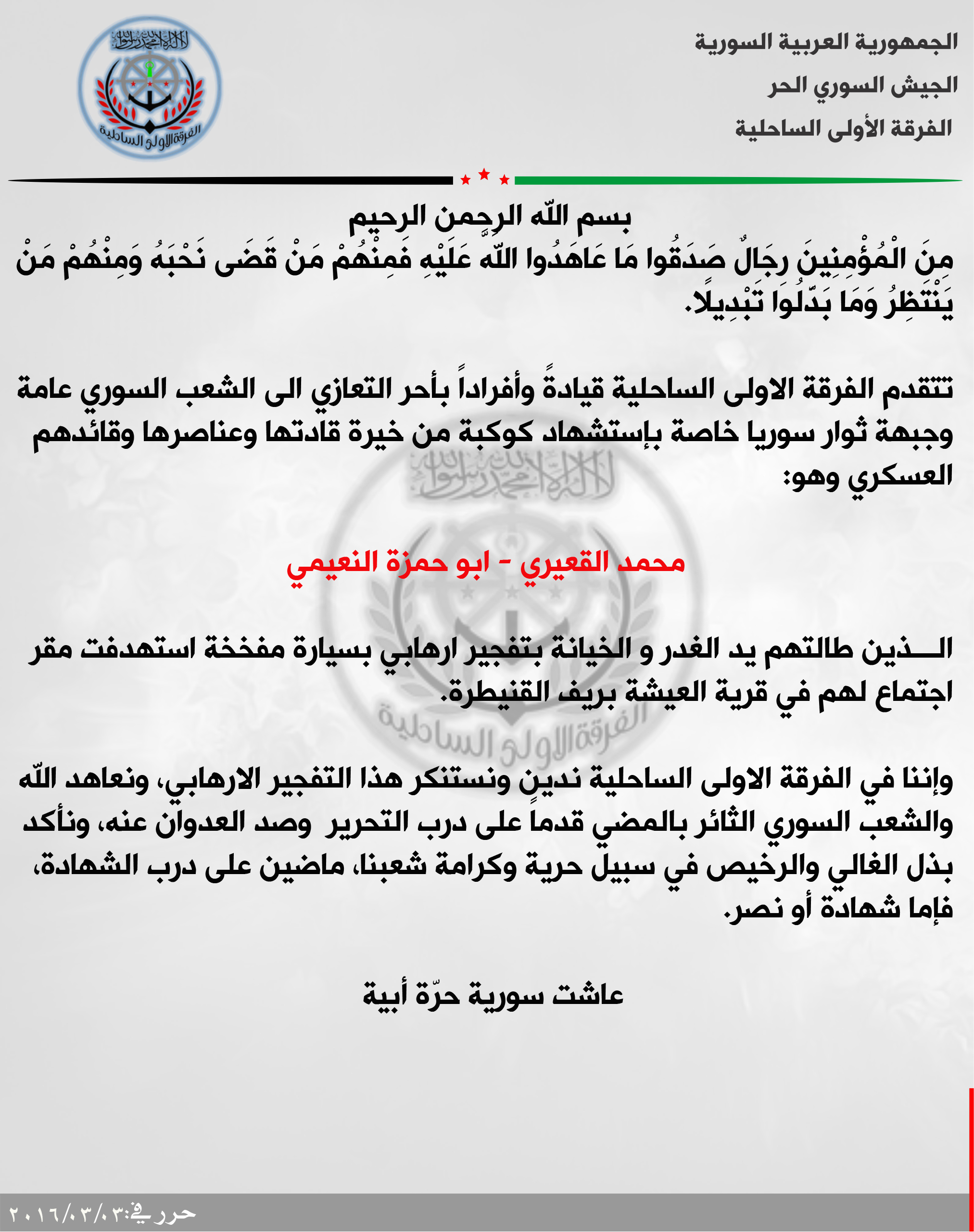 الفرقة الأولى الساحلية تعزي جبهة ثوار سوريا باستشهاد أبو حمزة النعيمي قائدها العسكري في القنيطرة
