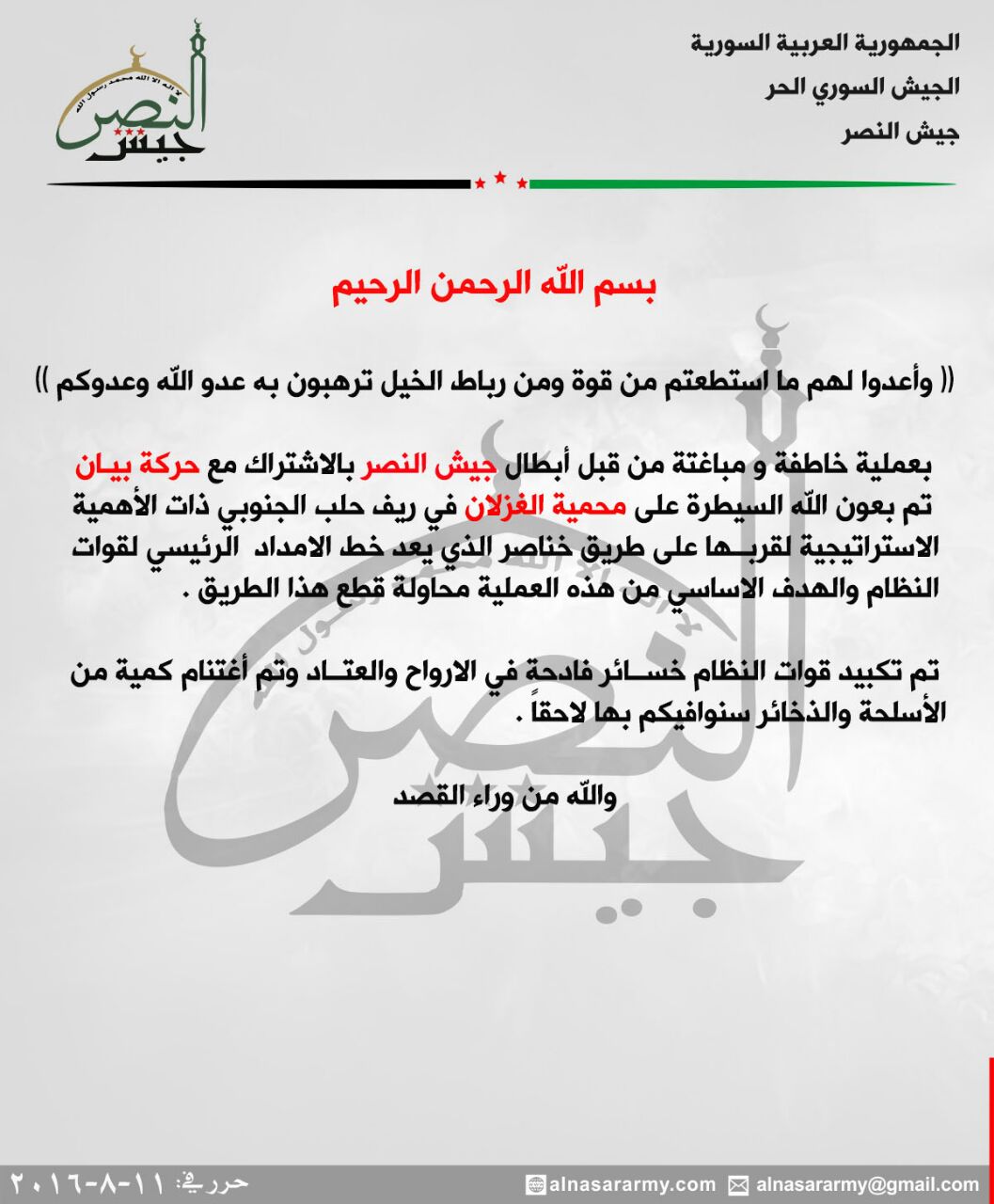 جيش النصر بالإشتراك مع حركة بيان يعلن السيطرة على محمية الغزلان بريف حلب الجنوبي