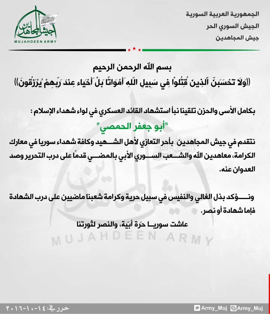 جيش المجاهدين يعزي لواء شهداء الإسلام باستشهاد قائده العسكري أبو جعفر الحمصي