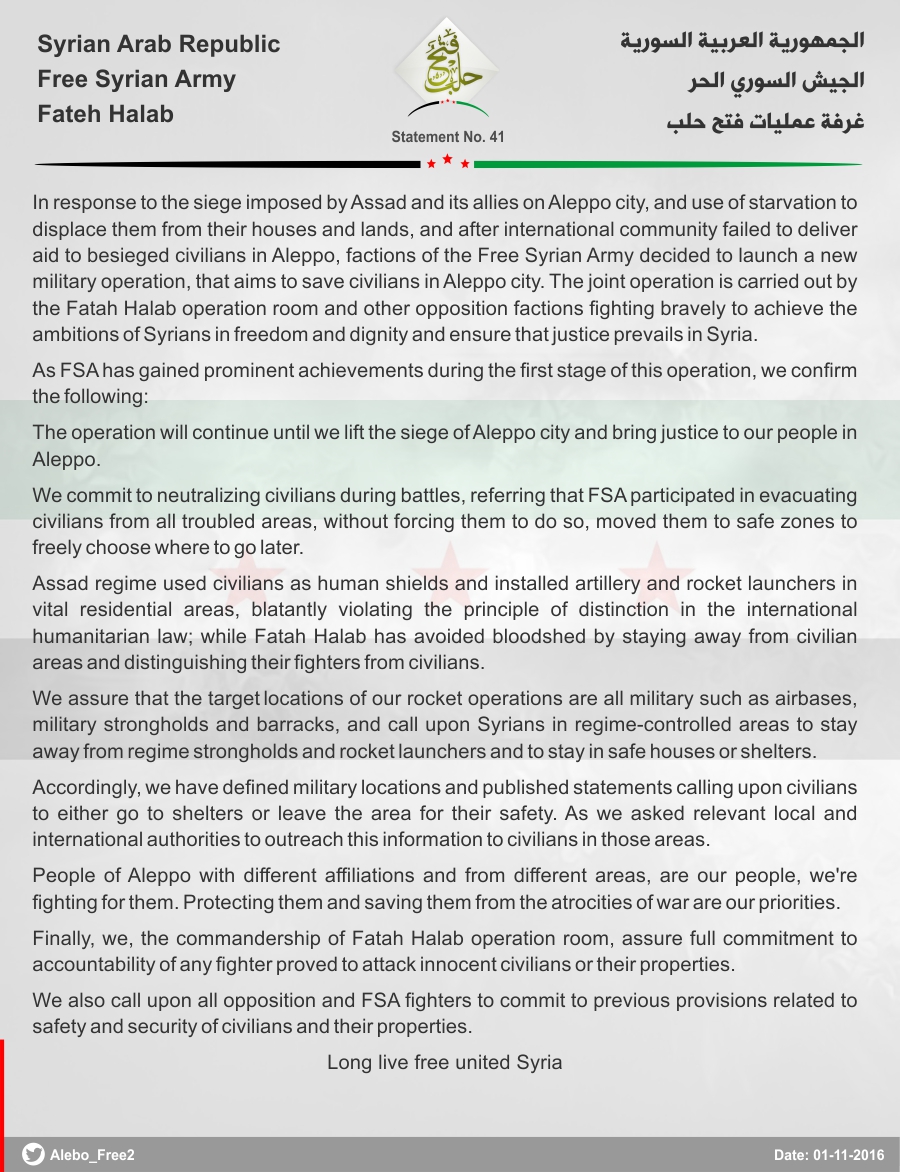 إعلان غرفة عمليات فتح حلب إطلاق عملية عسكرية تهدف إلى إنقاذ المدنيين