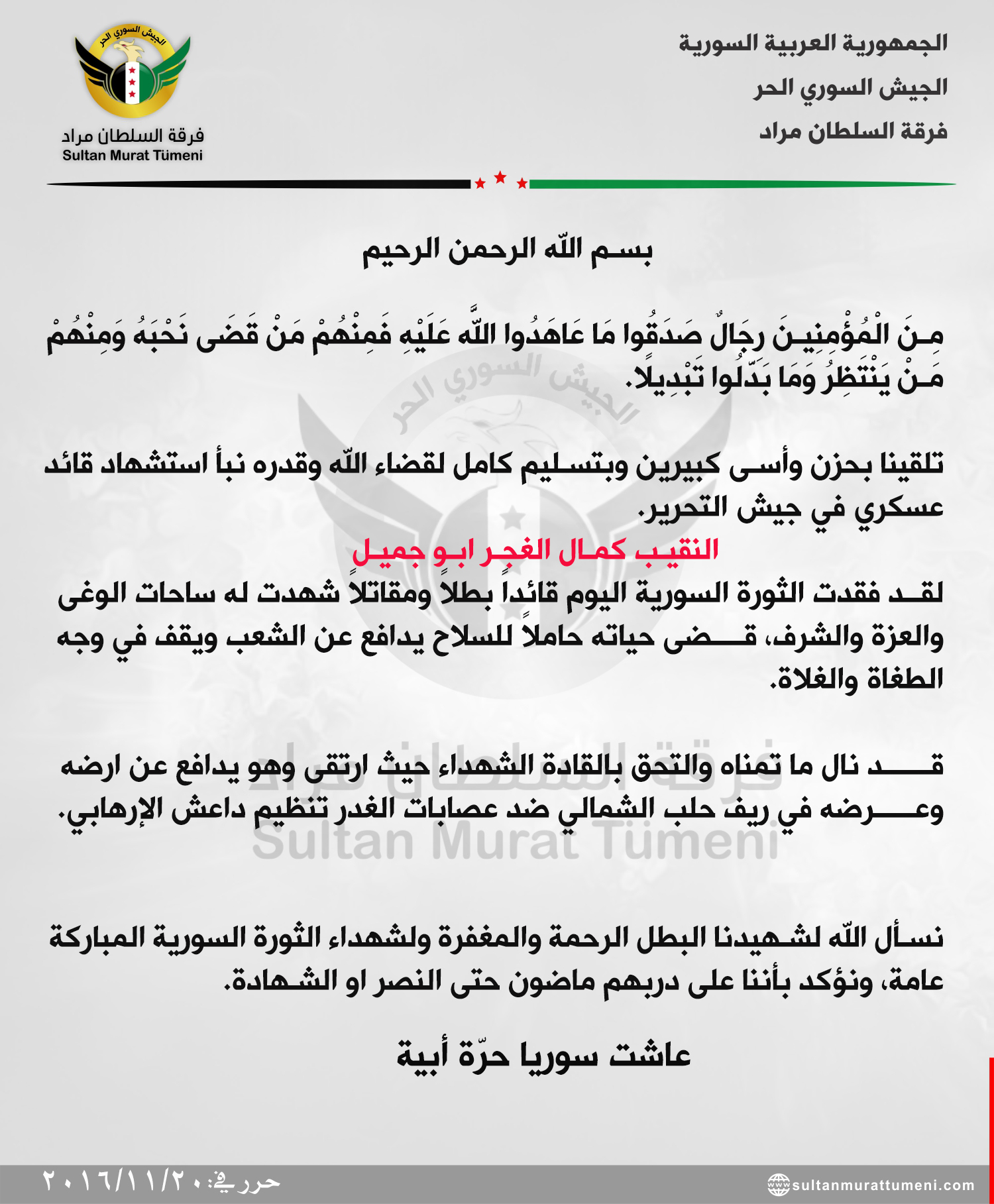 فرقة السطان مراد تعزي جيش التحرير باستشهاد النقيب كمال الغجر أحد قادته العسكريين