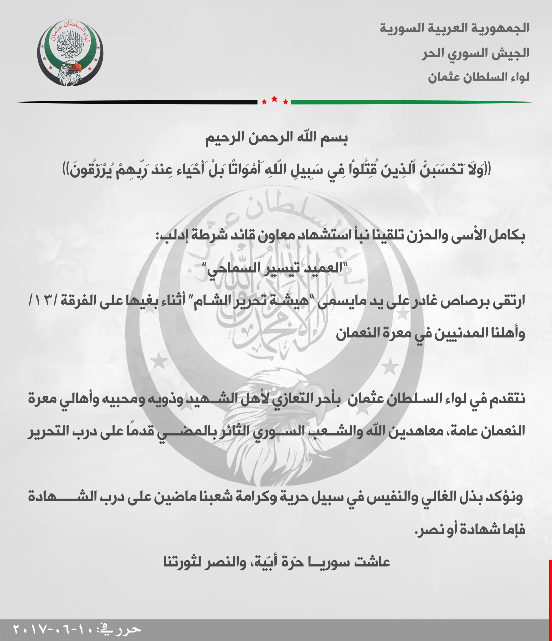 لواء السطان عثمان يعزي باستشهاد معاون قائد شرطة إدلب العميد تيسير سماحي برصاص هيئة تحرير الشام