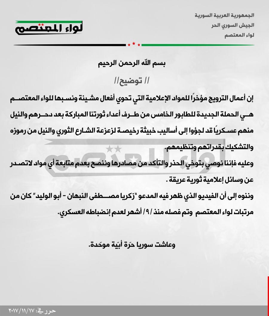 بيان لواء المعتصم حول الفيديو الذي يظهر فيه زكريا النبهان أبو الوليد